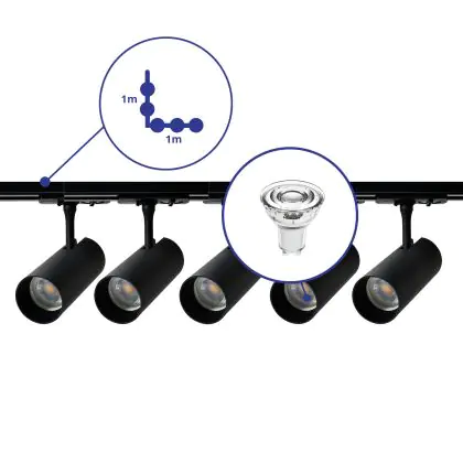 Complete Set 1-Phase Rail L 1 x 1 Meter Black | incl. 5x Spot + GU10 2700K 3W Dimmable + End Cap, Power Connector and L -Connector
